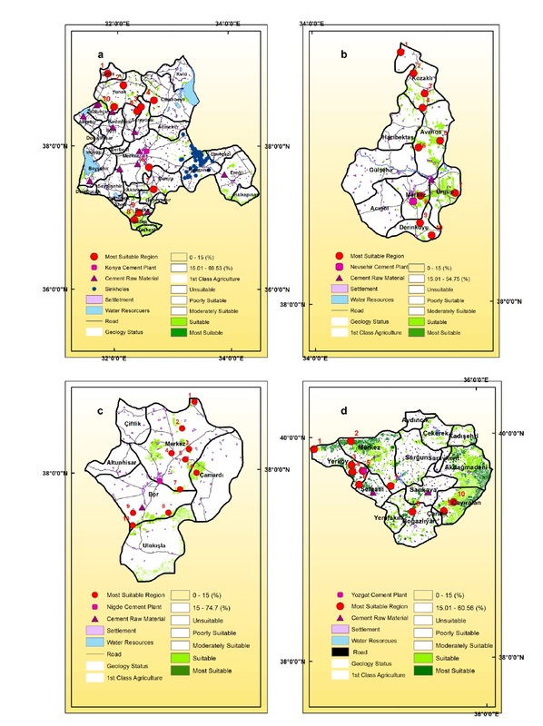 In this study, the most suitable locations for cement factory are identified by using the Geographical Information System and Multi-Criteria Decision Analysis [MCDM] in the Konya Plain Project [KPP] [Aksaray, Karaman, Kırıkkale, Kırşehir, Konya, Nevşehir, Niğde, Yozgat] provinces. The physical conditions of the region were determined based on the Environmental Impact Assessment Reports and expert opinions, and the suitable areas were chosen with technical, social, cultural, and economic criteria. In order to determine the most suitable regions, A three-stage decision-making process and Scoring System has been used for KPP Provinces. Overall, 56 suitable regions were decided among these provinces. The most suitable facility locations were chosen 7th and 6th region of Karaman province, 5th region of Kırıkkale province, 1st and 4th region of Konya Province.